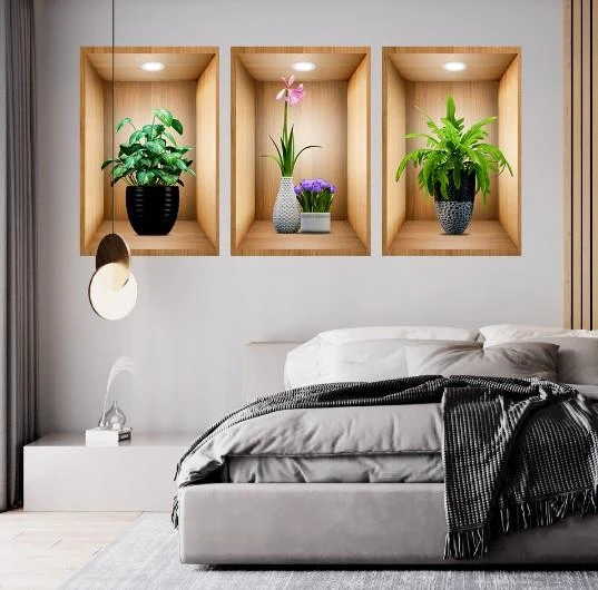 3D Çiçek Vazo Duvar Sticker 3 lü Set Kahverengi Fon