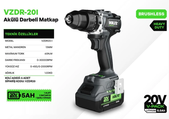 VOLTZ - 60 Nm - 20 Volt 5 Amper Profesyonel Akülü Matkap Vidalama (VZDR-20I )