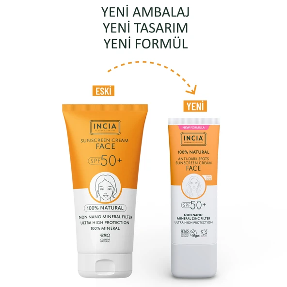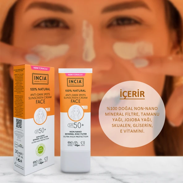 INCIA %100 Doğal Yüz Güneş Kremi Leke Karşıtı Mineral Filtreli Yüksek Koruma SPF50 UVA UVB 50 ml
