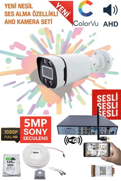 1 Kameralı Sesli Güvenlik Kamera Seti - Gece Renkli, 5MP Sony SecuLens, 1080P Full HD AHD, 4 Warm LED, 5MP DVR + WiFi Adaptörü