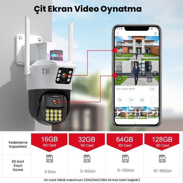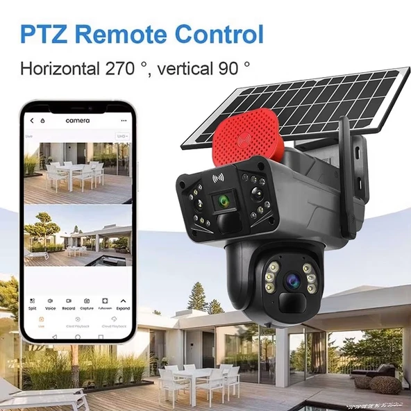 Solar Panelli, Güneş Enerjili, SIM Kartlı 4G, 6MP Çift Lensli PTZ Güvenlik Kamerası – Hareket Algılama 128 GB SD Kart Hediyeli
