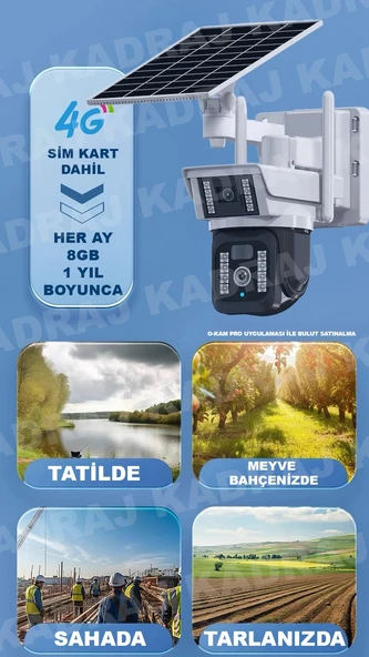 Kadraj Solar Panelli, Sim Kartlı, HER AY 8GB INTERNET, 128GB SD Kart, 6MP, SESLI KONUSMA, 360° GÖRÜŞ AÇISI, 4G GÜNEŞ PANELLİ GÜVENLİK KAMERASI