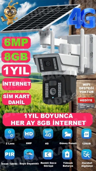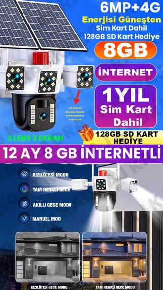 Sim Kartlı Güvenlik Kamerası, Güneş Panelli, 6MP LENS, 8GB X 12 AY İNTERNET DAHİL + 128GB SD KART