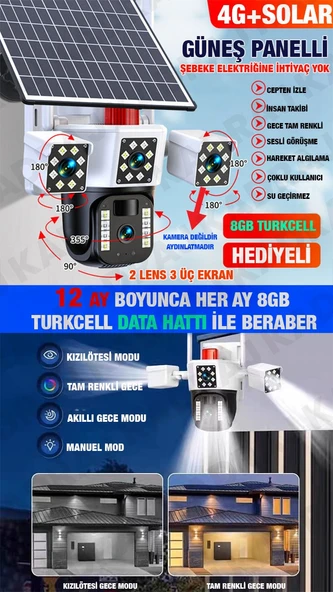 4 Kameraları 4G - eSim Solar Panelli, Her ay 15GB Turkcell 1 Yıl Hediyeli, 7/24 Kayıt Aov, Hareket AlgılamA, 128Gb Sd Kart Hediye, Alarm,