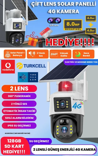 UNIYWELL 4G Solar Panelli Güvenlik Kamerası, Güneş Enerjili , 8MP Çift Lens, Sim Kartlı, PTZ, Su Geçirmez