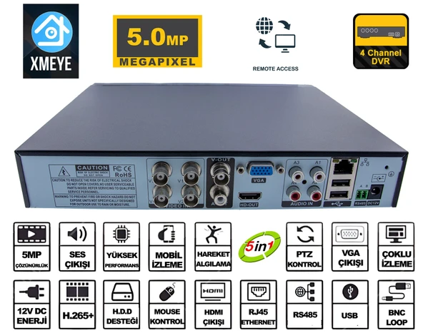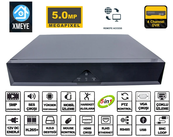 Kadraj 4 Kanal 5MP Kamera Kayıt Cihazı AHD DVR 1080P H265+ Plus 5in1 Hibrit Xmeye