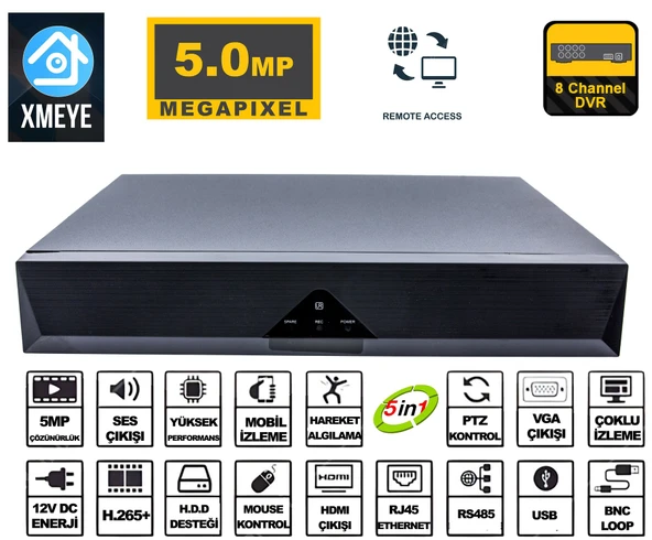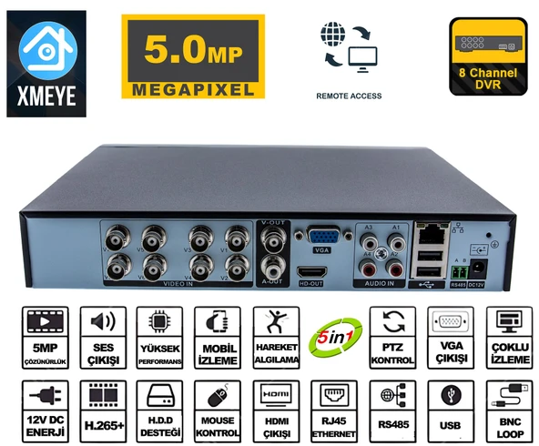 Kadraj 8 Kanal 5MP 1080P Kamera Kayıt Cihazı AHD DVR H265+ Plus 5in1 Hibrit Xmeye