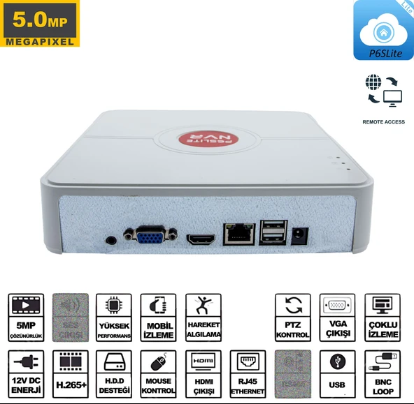 Kadraj NVR Kayıt Cihazı 9 Kanal 5MP 1080P H265 5in1 Hibrit P6SLite