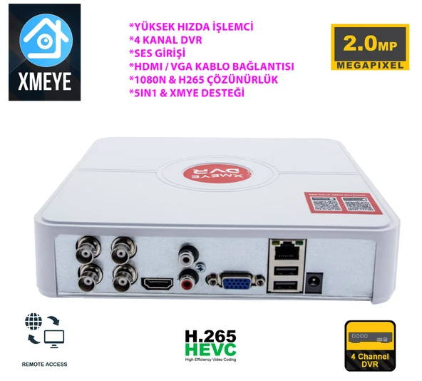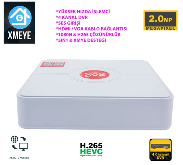Kadraj 4 Kanal 2MP Kayıt Cihazı AHD 1080N H265+ Plus 5in1 Xmeye Yüksek Performans