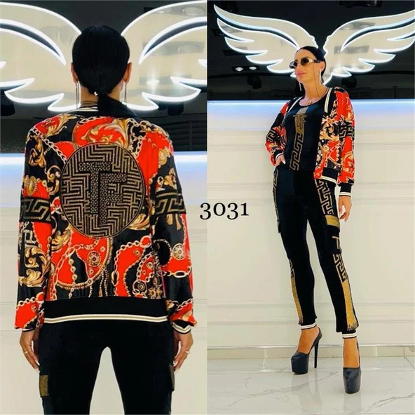 Tatu Angel Karışık Desen Crystal Taşlı Eşofman Takımı - FUŞYA