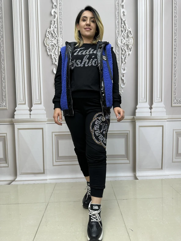 Derili Kürklü Crystal Taşlı Eşofman Takımı - SİYAH GÜMÜŞ