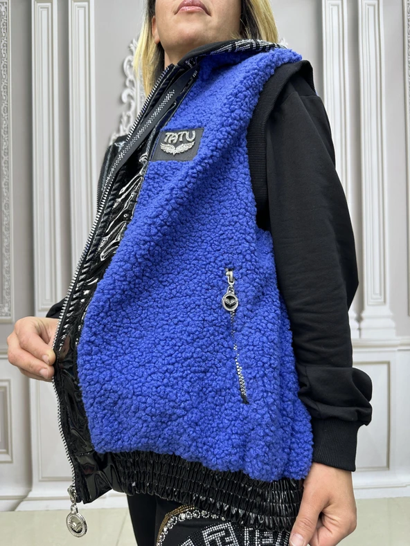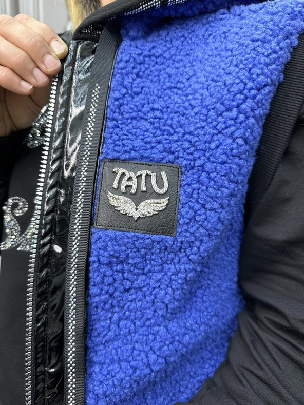 Yarı Peluş Crystal Taşlı Şişme Kaban - SİYAH GÜMÜŞ