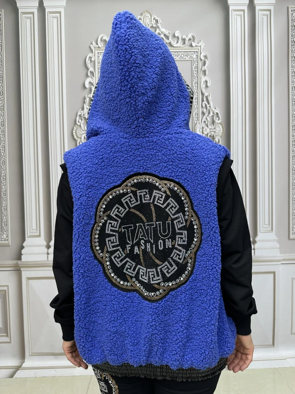 Sırt Kanat Detay Kürklü Yelekli Crystal Taşlı Üçlü Takım - PUDRA