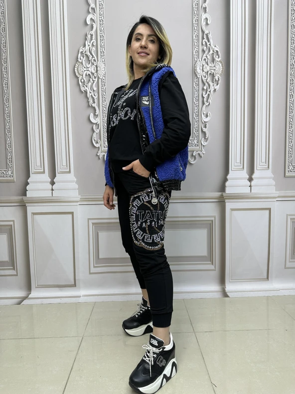 Tf Kaplan Crystal Taşlı Eşofman Takımı - SİYAH