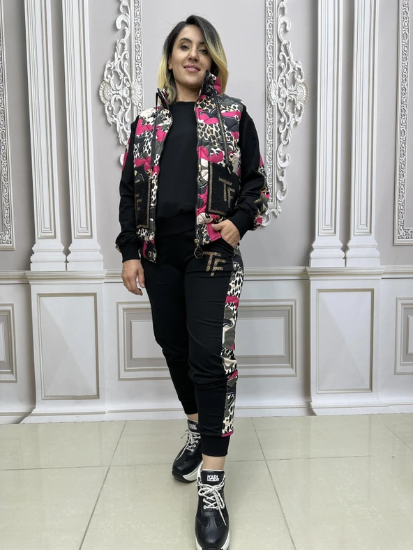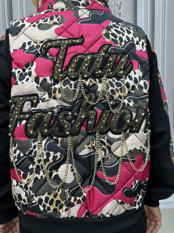Yelek Zincir Detay Şişme Yelekli Crystal Taşlı Üçlü Takım - FUŞYA
