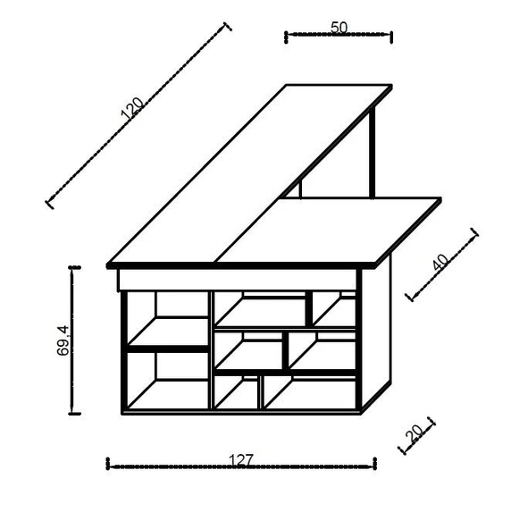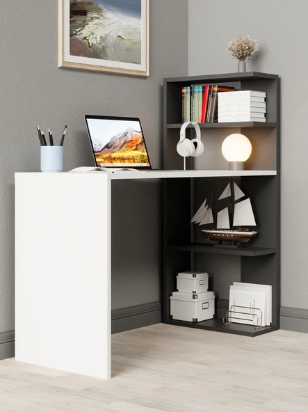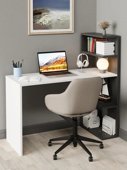 Shelka Kitaplık Raflı Çalışma Masası Antrasit Beyaz