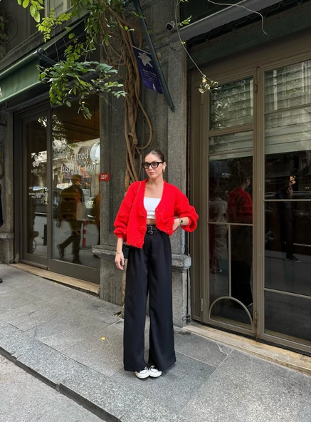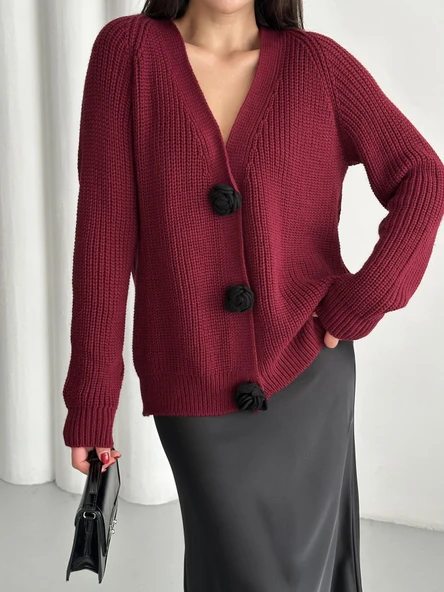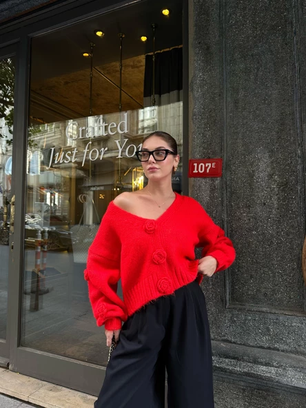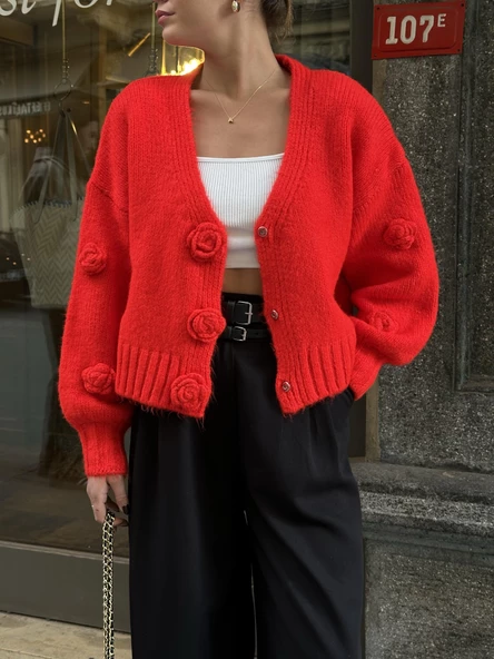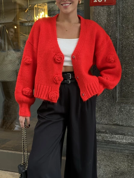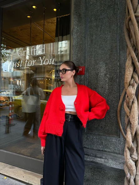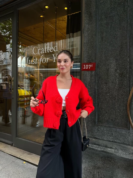 Kırmızı Zyra Kendinden Çiçek Düğmeli Hırka