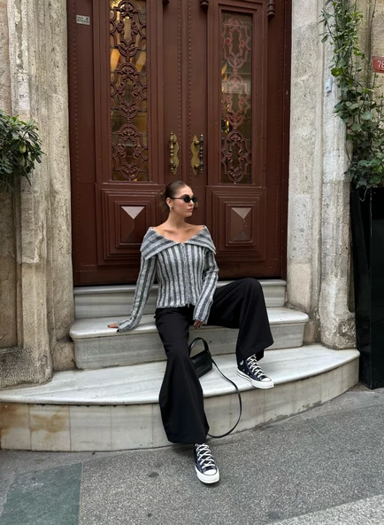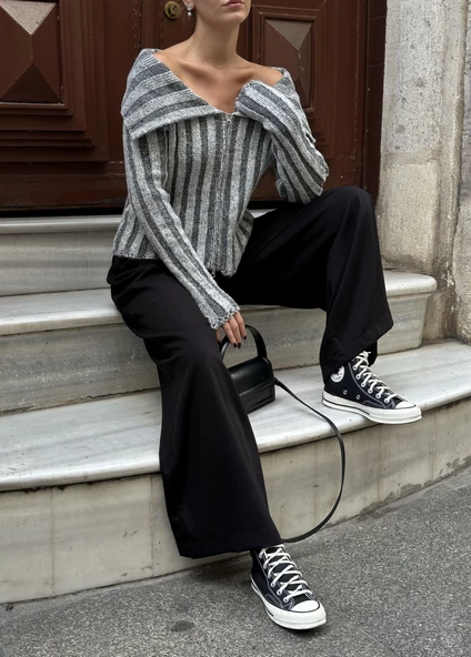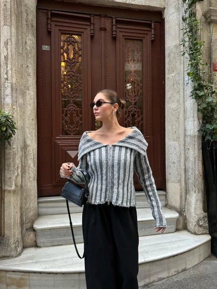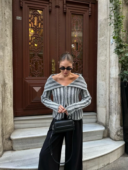 Siyah-Fildişi Beyazı Çizgili Fermuarlı Süveter