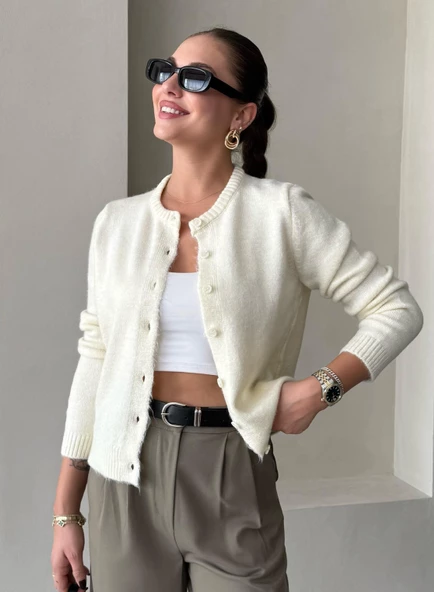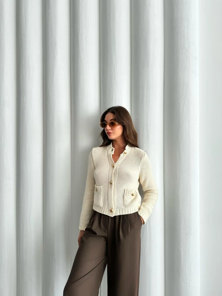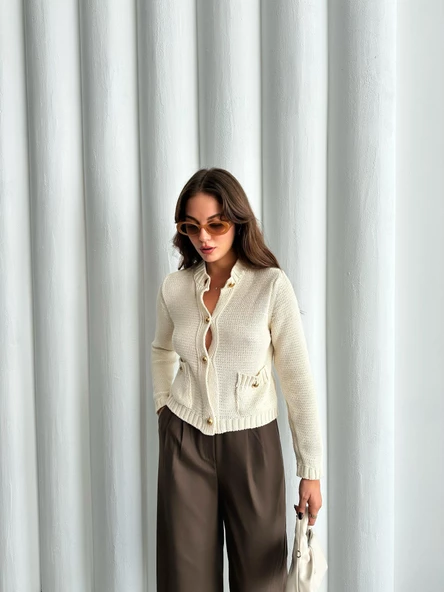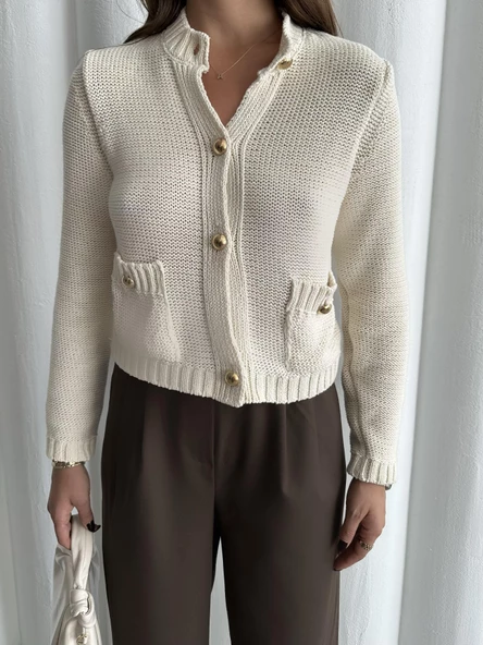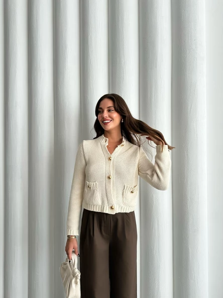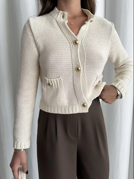 Krem Candy Metal Düğmeli Cepli Örme Hırka