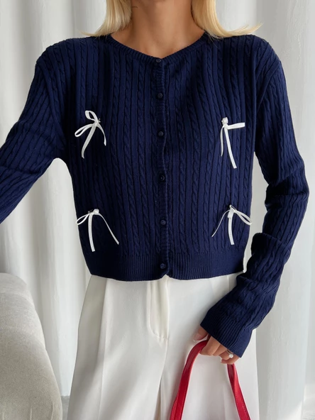 Krem Lacivert Tek Şeritli Cep Detaylı Detaylı Hırka