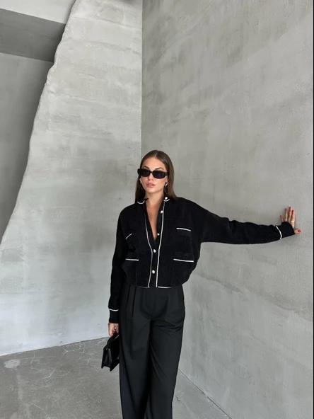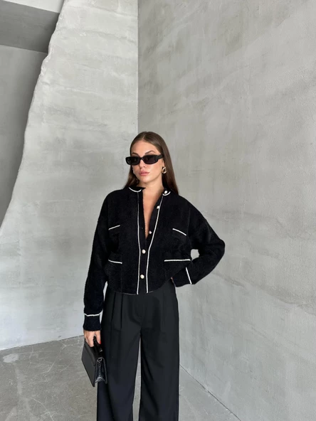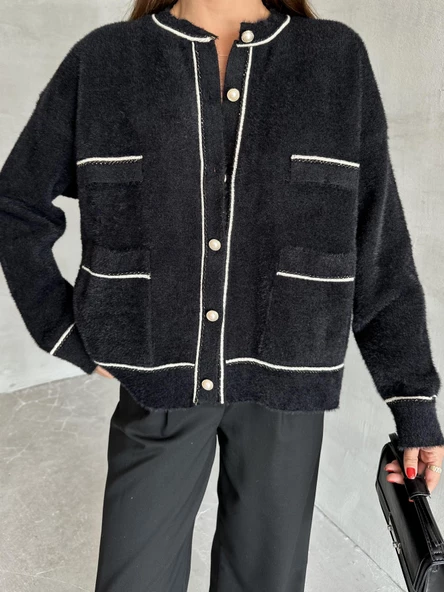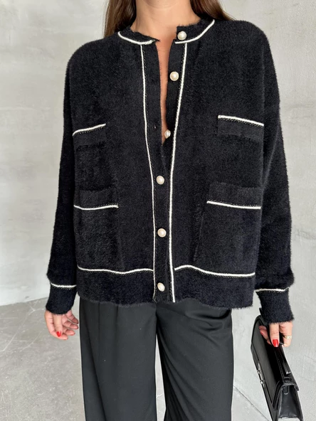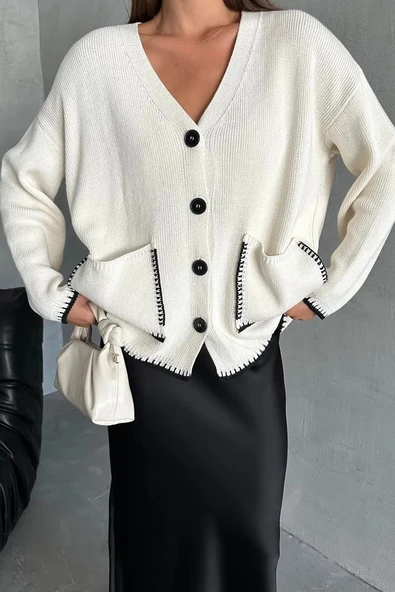 Krem-Siyah Yakası Pirit Geçmeli Hırka