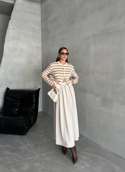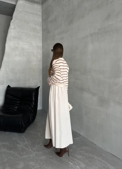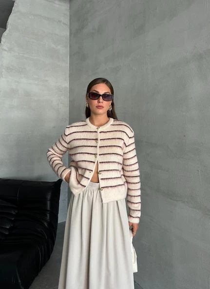 Bordo-Ekru Yumoş Enine Çizgili Hırka
