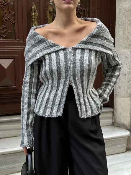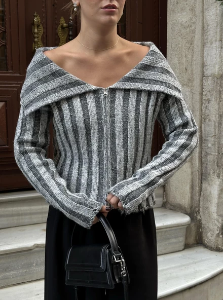 Antrasit Geniş Katlı Yaka Fermuarlı Hırka