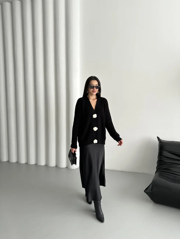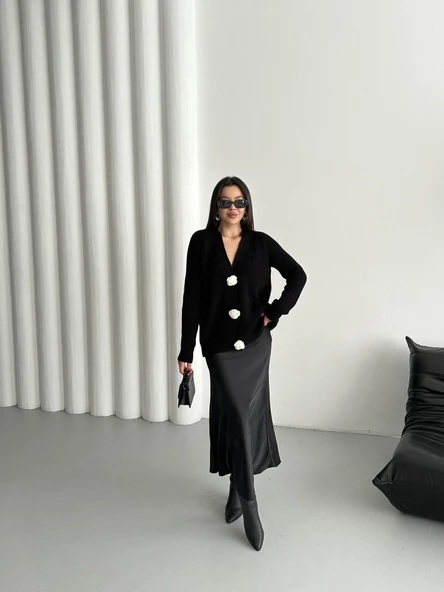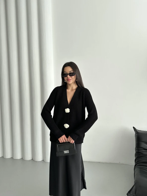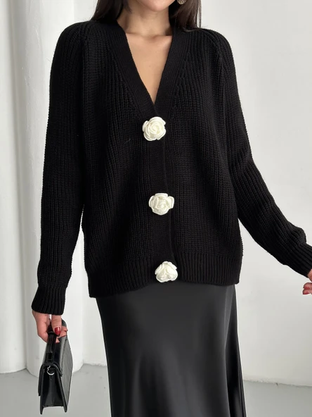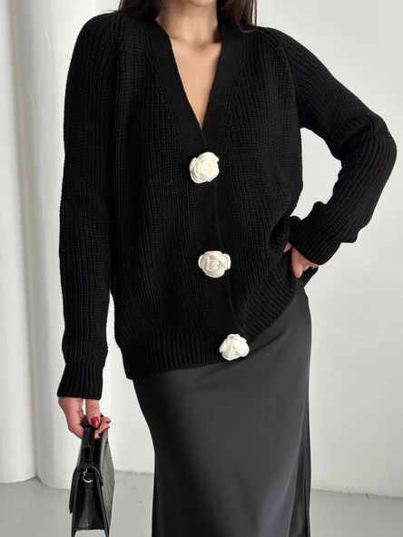 Siyah Düzensiz Çiçek Düğmeli Hırka