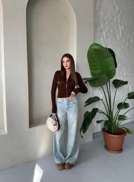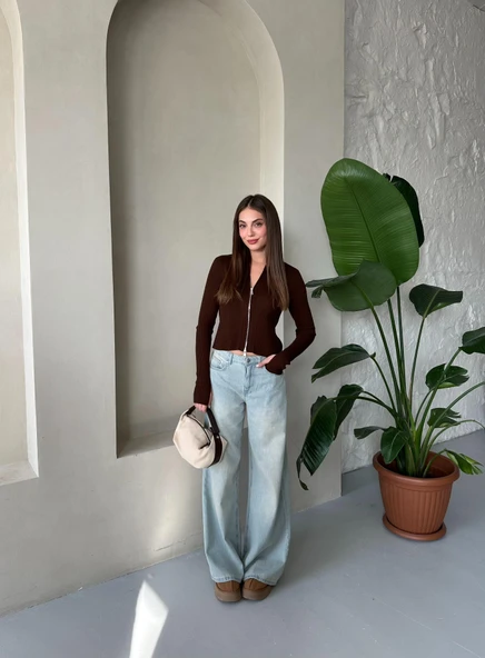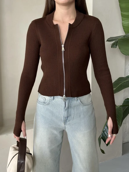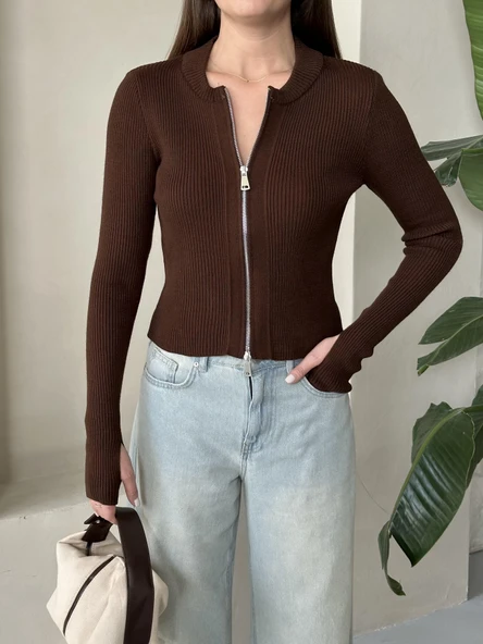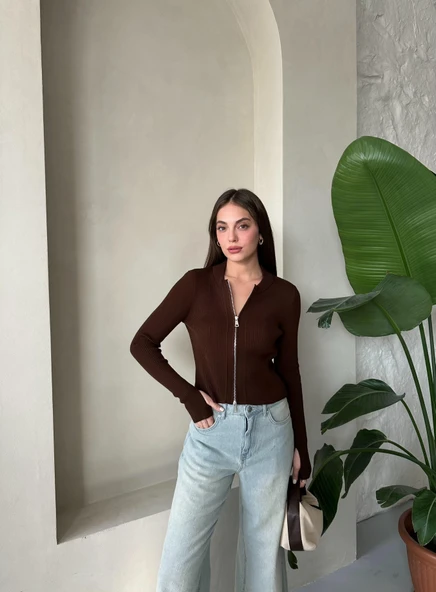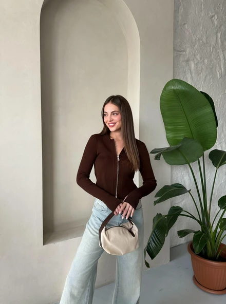 Kahverengi Çift Fermuarlı El Geçme Detaylı Ayarlanabilir Hırka