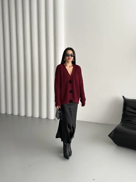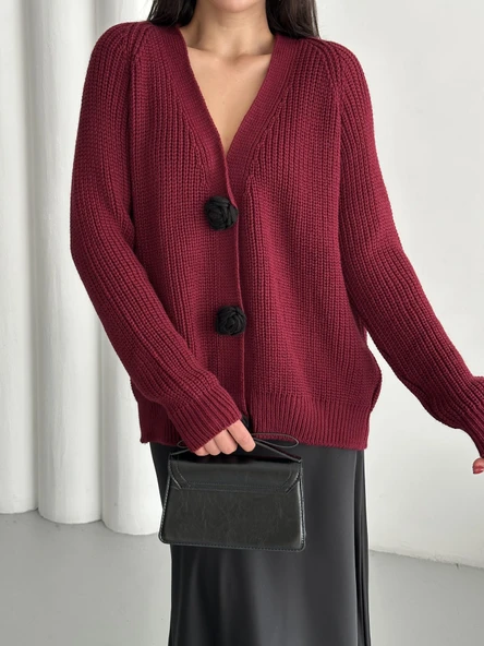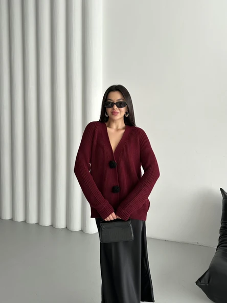 Bordo Gümüş Düğmeli Baklava Desenli Hırka
