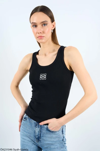 Siyah-Gümüş Halter Yaka Off Simli Nakışlı Atlet