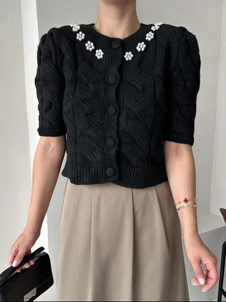 Siyah Yakası Çiçek Boncuklu Yarım Kol Örme Hırka