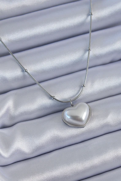 316L Çelik Gümüş Renk İncili Kalp Model Minimal Top Detay Kadın Kolye - TJ-BKO7614