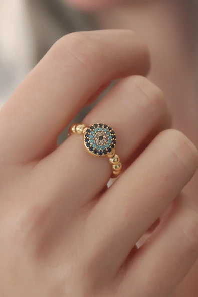 Gold Renk Nazar Boncuk Figür Zirkon Taş Detay Kadın Yüzük - TJ-BYK2413