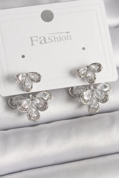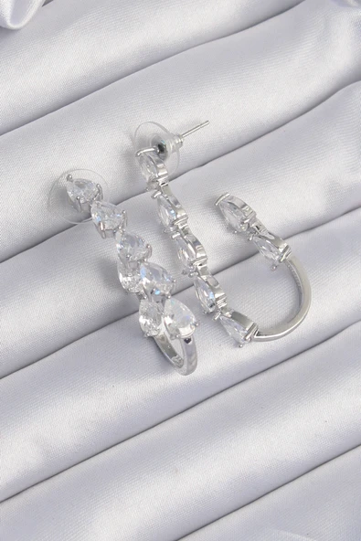 Pirinç Gümüş Renk Damla Zirkon Taş Tasarımlı Küpe - TJ-BKP9197