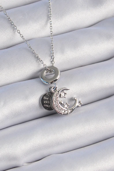 316L Çelik Gümüş Renk Zirkon Taşlı Ay Yıldız Figür Charm Model Kadın Kolye - TJ-BKO9311