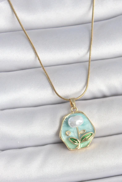 316L Çelik Gold Renk Zincir Mavi Çiçek İşlemeli İnci İşlemeli Portre Model Kadın Kolye - TJ-BKO10126