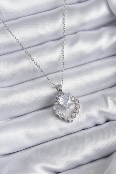 316L Çelik Zincir Gümüş Renk Zirkon Taşlı Kalp Model Kadın Kolye - TJ-BKO7829