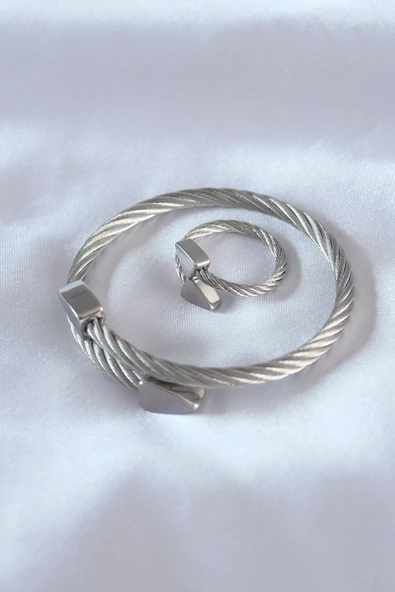 Çelik Gümüş Renk Burgu Model Erkek Bileklik Yüzük Seti - TJ-EB3592