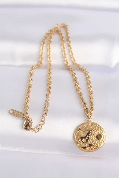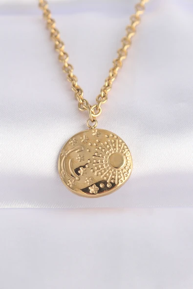 316L Çelik Gold Renk Zincir Beyaz Mineli Güneş İşlemeli Zirkon Taş Detaylı Madalyon Model Kadın Kolye - TJ-BKO10055