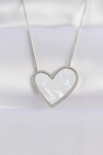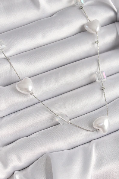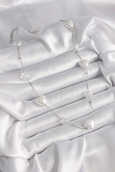 Pirinç Gümüş Renk Beyaz İnci Kalp Model Kadın Kolye - TJ-BKO9624