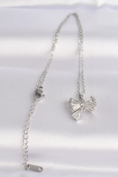 316L Çelik Zincir Gümüş Renk Zirkon Taşlı Kelebekli Mineli Ay Kolye - TJ-BKO9094