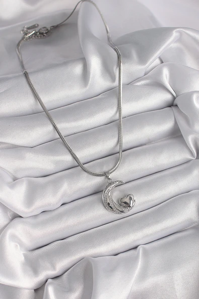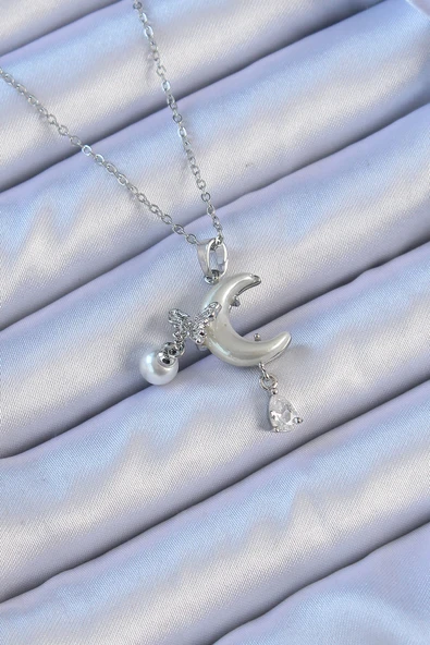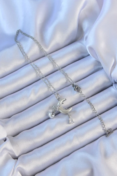 316L Çelik Gümüş Renk Zirkon Taşlı Ay Yıldız Figür Charm Model Kadın Kolye - TJ-BKO9311