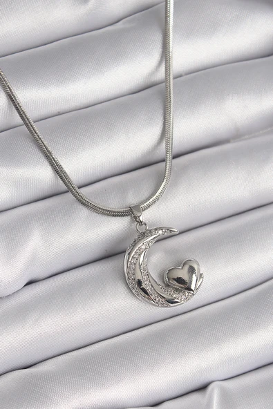 316L Çelik Gümüş Renk İtalyan Zincir Zirkon Taşlı Halil Figür Kalp Detay Kadın Kolye - TJ-BKO9590