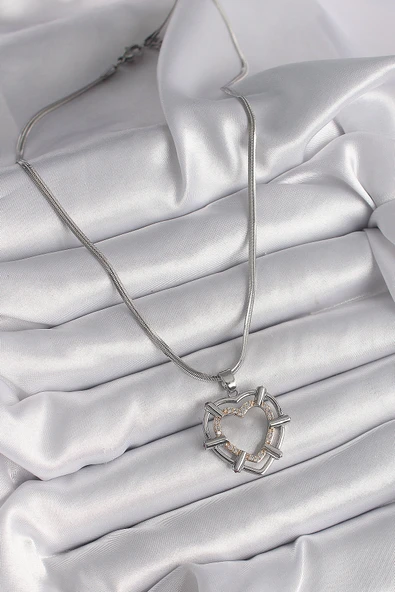 316L Çelik Zincir Gümüş Renk Zirkon Taşlı Kalp Detay Fiyonk Kolye - TJ-BKO8602
