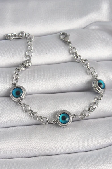 316L Çelik Gümüş Renk Zincir Model Nazar Boncuklu Kadın Bileklik - TJ-BB6653