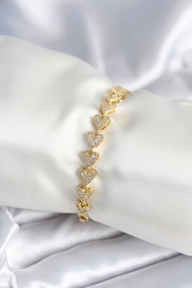 Pirinç Sıralı Kalp Figürlü Zirkon Taşlı Gold Renk Kadın Bileklik - TJ-BB6981