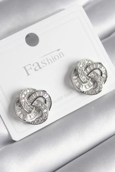 Pirinç Gümüş Renk Zirkon Taşlı Düğüm Halka Model Kadın Küpe - TJ-BKP9944