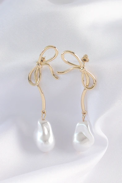 Pirinç Gold Renk Fiyonk Model İnci Taşlı Uzun Küpe - TJ-BKP8923