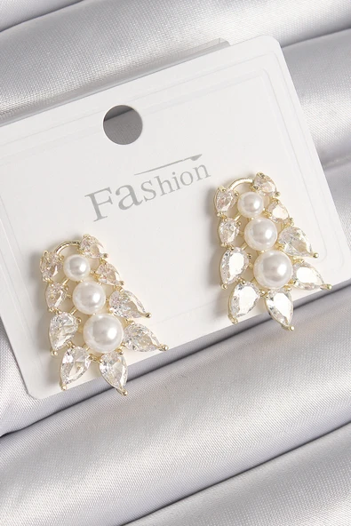 Pirinç Gold Renk Zirkon Taşlı Yaprak Model İnci Detay Kadın Küpe - TJ-BKP9800